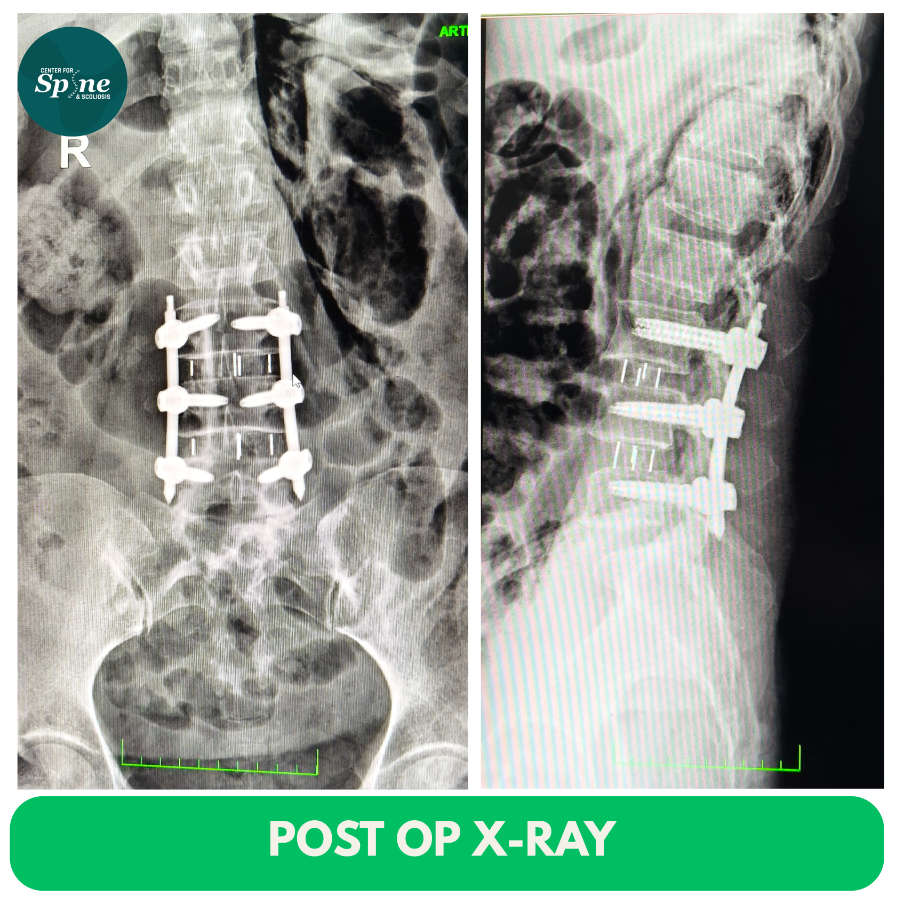The surgery was performed successfully without complications. Postoperatively, the patient experienced significant and early relief from back and leg pain, along with marked improvement in neurological symptoms.