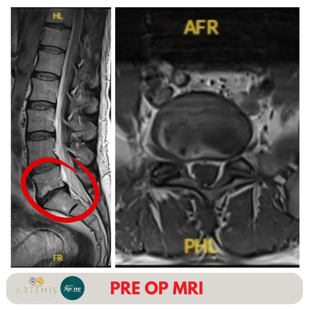 At Artemis Hospital, he was evaluated by Dr. Hitesh Garg, Head of Orthopaedic Spine Surgery. A detailed clinical examination and imaging studies revealed a prolapsed intervertebral disc at L5–S1, causing right-sided foraminal stenosis, nerve root compression, and radiculopathy.