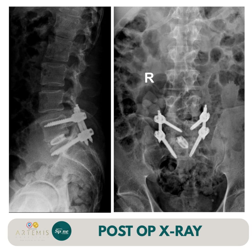 The surgery was performed successfully, achieving optimal decompression of the affected nerve root and stabilisation of the spinal segment. Postoperatively, the patient experienced significant relief from radiating leg pain and gradual improvement in motor strength. With structured rehabilitation and expert post-operative care, his recovery progressed smoothly.